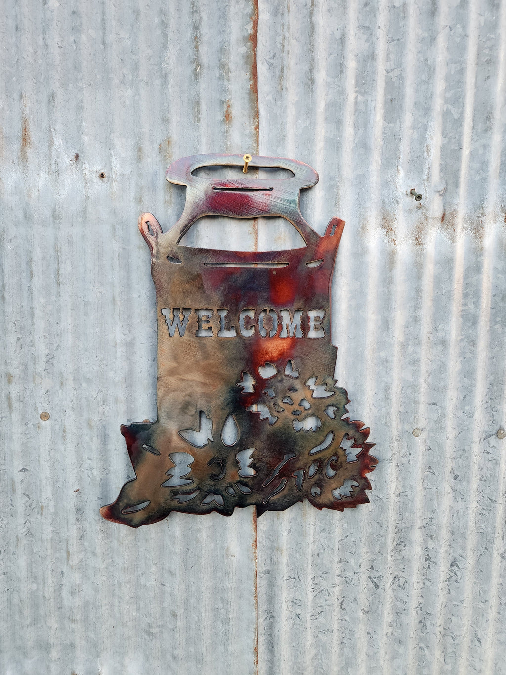 The finish is a hand applied patina with a 2-part clear coat to keep the piece looking good hanging indoors or outdoors. The colors will change depending on the intensity, time, color, and angle of lighting. This metal art piece is approximately 13" wide x 18" high and plasma cut from 11-gauge steel. Depending on exposer to elements piece may need additional clear coat applied (can from any hardware store)